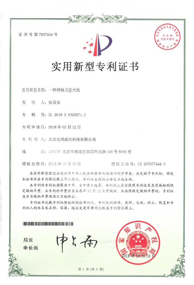 实用新型专利证书7957444:一种双轴卫星天线